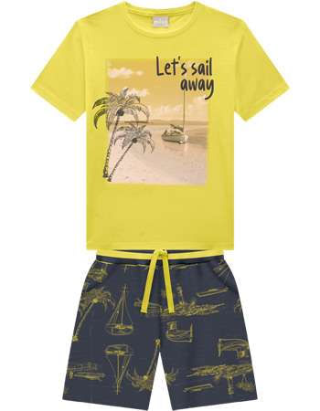 O Conjunto Infantil Masculino Camiseta + Bermuda Milon é composto por camiseta em meia malha e bermuda em moletom sem felpa. A camiseta possui decote com acabamento em debrum e estampa frontal moderna com bordado. A bermuda possui cós com elástico rebatido confortável e acabamento em retilínea contrastante, bolso funcional e cadarço decorativo.