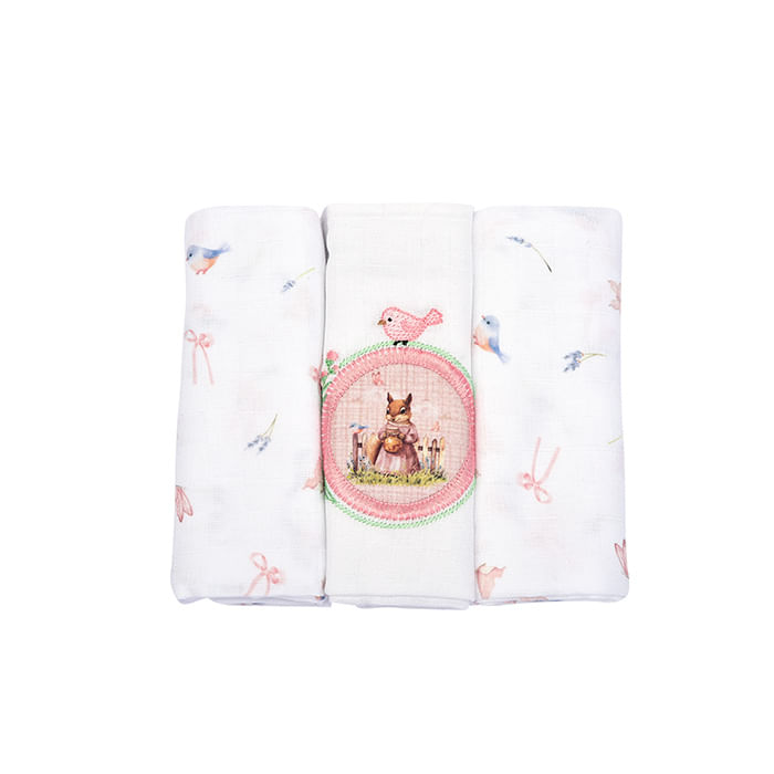 O kit contém 3 unidades com estampas delicadas e detalhe central aplicado, trazendo charme e um acabamento diferenciado. A bainha reforçada proporciona maior resistência, evitando desfiados e aumentando a vida útil da peça.