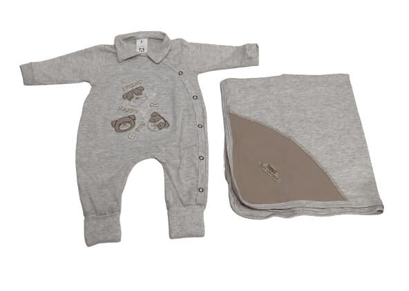 O jogo macacão e manta vem com um macacão lindo de malha e uma manta que também é malha buscando sempre as últimas tendências da moda para o seu bebê.