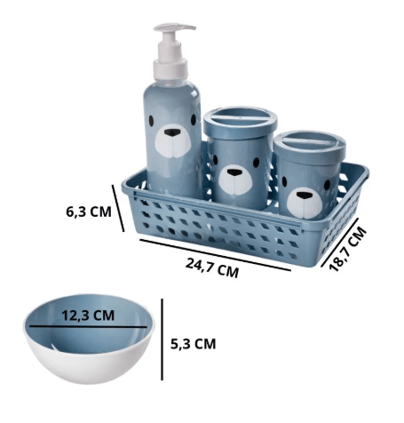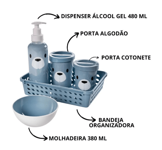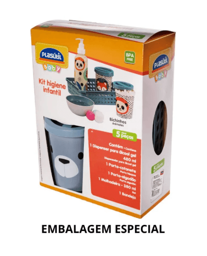 A nova linha da Plasútil - Bear - é minimalista e lúdica. Com cores suaves que transmitem serenidade e aconchego, os produtos para composição do enxoval são funcionais e acompanharão as mamães e papais de primeira viagem do nascimento até as fases de transição. - BPA FREE: livre de bisfenol-A e atóxico. Fabricado em plástico polipropileno (PP). - O momento de trocar o (a) recém-nascido (a), pode gerar certo nervosismo, não é mesmo? Por isso, ter produtos que tornem esse momento prático fazem muita diferença no dia-a-dia. Nosso kit higiene é composto por itens essenciais que ajudarão nos cuidados com o (a) bebê, além de organizar as cômodas e trocadores. - Composto por: 1 bandeja organizadora: 24,7 x 18,7 x 6,3 cm. 1 dispenser para álcool gel de 480 ml: 6,5 x 23,1 cm. 1 molhadeira de 380 ml: 12,3 x 5,3 cm. 1 porta cotonete 300 ml: 8,3 x 10,2 cm. 1 porta algodão 430 ml: 9,0 x 20,8 cm. - Kit possui embalagem especial: ideal para presentear.
