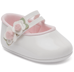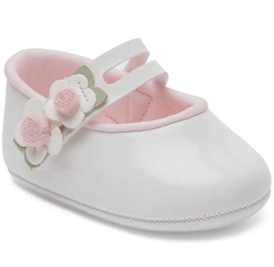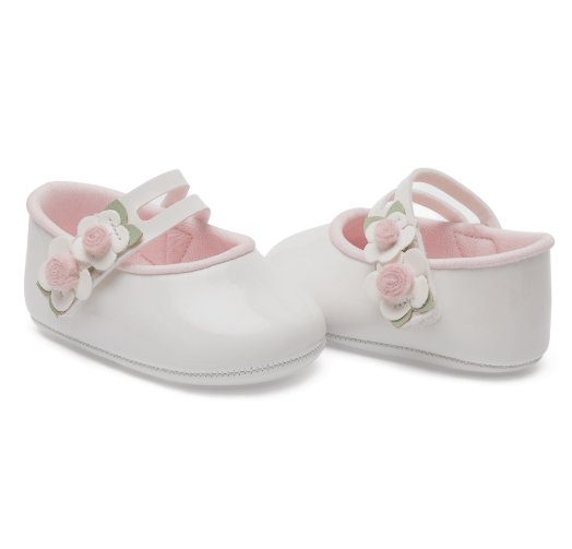 Confeccionada em material macio, possui interior acolchoado na cor rosa suave, garantindo bem-estar ao longo do uso. O design clássico em tom branco conta com delicadas flores aplicadas na parte frontal, que trazem um toque romântico e sofisticado. O fechamento com tiras proporciona melhor ajuste aos pezinhos, ajudando a manter a sapatilha firme e confortável.